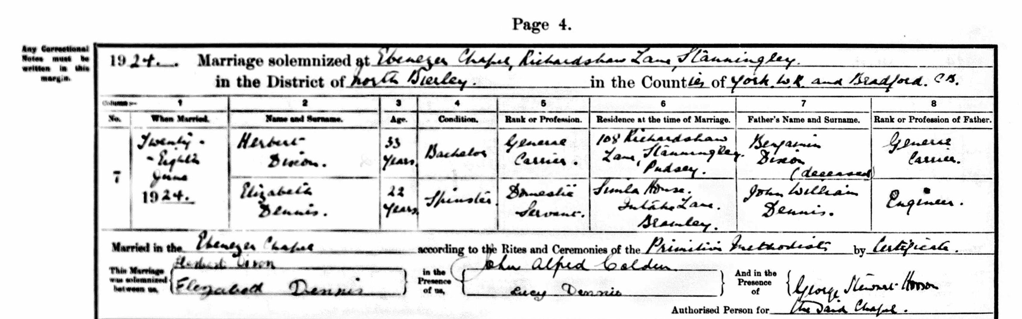 Home Surname List Name Index Sources Email Us | Family Group SheetHUSBAND | Herbert Dixon  | DEATH | about 1965 | | MARRIAGE | 28 June 1924 | Ebenezer Chapel, Richardshaw Lane, Stanningley, North Bierley, Bradford, West Riding Yorkshire | | WIFE | Elizabeth Dennis2  | BIRTH | 25 February 1902 | Goldthorpe, Yorkshire | CHR | 13 March 1902 | Bolton Upon Dearne66 | RESIDENCE | 13 March 1902 | ; 1 Bath Row, Goldthorpe | CENSUS | about 1911 | 35 Kelly Street, Goldthorpe, Rotherham, Yorkshire58 | DEATH | about 1967 | ; | FATHER | John William Dennis | MOTHER | Lucy Hole |