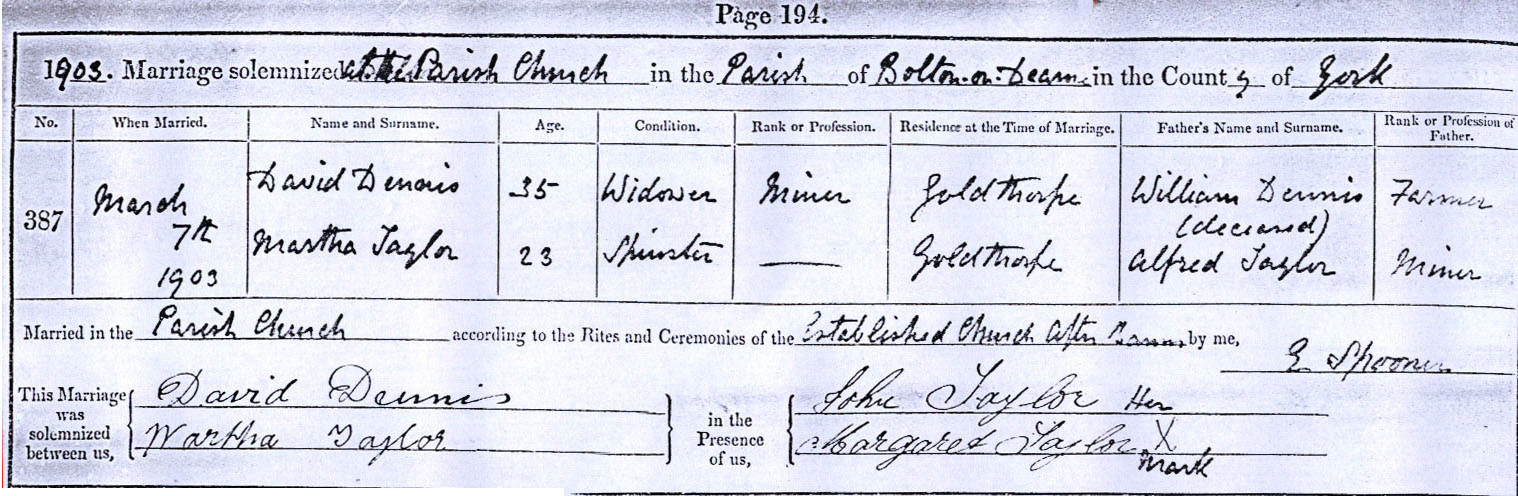 Home Surname List Name Index Sources Email Us | Family Group SheetHUSBAND | David Dennis9,23,26,127  | BIRTH | October 1867 | Ampthill, Bedfordshire, United Kingdom26 | BIRTH | 1 October 1867 | Upper Gravenhurst Bedfordshire23,127 | BIRTH | about 1869 | Graven Hurst, Bedfordshire, England9 | CENSUS | about 1871 | Upper Gravenhurst Bedfordshire | OCCUPATION | between 1881 and 1934 | ; Coal Miner | RESIDENCE | about 1891 | ; 14 Cass Yard, Kirkgate, Wakefield, Yorkshire. | RESIDENCE | about 1891 | ; Wakefield, Yorkshire, England9 | RESIDENCE | 2 April 1911 | ; Bolton upon Dearne, Yorkshire-West Riding, England127 | CENSUS | 2 April 1911 | Doncaster Road, Goldthorpe Lane Ends, Bolton Upon Dearne, Yorkshire West Riding, England, United Kingdom | RESIDENCE | 14 March 1917 | ; 40 Queen Street, Goldthorpe, Yorkshire | DEATH | 24 May 1934 | ; Goldthorpe Barnsley | DEATH | June 1934 | ; Doncaster, Yorkshire West Riding, England23 | MARRIAGE | 7 March 1903 | Goldthorpe Barnsley128 | MARRIAGE | 30 March 1889 | Charlotte Bowell; Wakefield, West Yorkshire | FATHER | William Dennis | MOTHER | Ruth Rowbottom | | WIFE | Martha Taylor17,127,132  | BIRTH | 21 November 1879 | Willenhall, Staffordshire17,127 | CENSUS | about 1881 | Willenhall, Staffordshire | BIRTH | about 1881 | Short Heath, Staffordshire, England132 | RESIDENCE | about 1891 | ; Walsall Foreign, Staffordshire, England17 | RESIDENCE | about 1901 | ; Walsall, Staffordshire, England132 | RESIDENCE | 2 April 1911 | ; Bolton upon Dearne, Yorkshire-West Riding, England127 | RESIDENCE | 14 March 1917 | ; 40 Queen Street, Goldthorpe, Yorkshire | DEATH | 16 June 1946 | ; Slough, Berkshire | FATHER | Alfred Taylor | MOTHER | Christiana Milns |