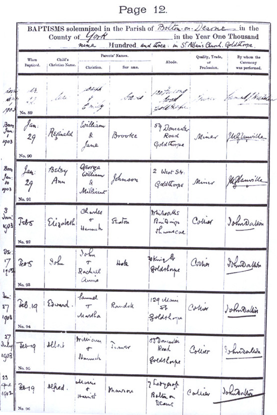 | 4. | Sam Hole MALE | | BIRTH | 30 January 1909 | Bolton upon Dearne, Yorkshire | CHR | 18 February 1909 | Bolton upon Dearne, Yorkshire | RESIDENCE | 20 December 1909 | ; 120 Furlong Road, Bolton upon Dearne, Doncaster, Yorkshire |