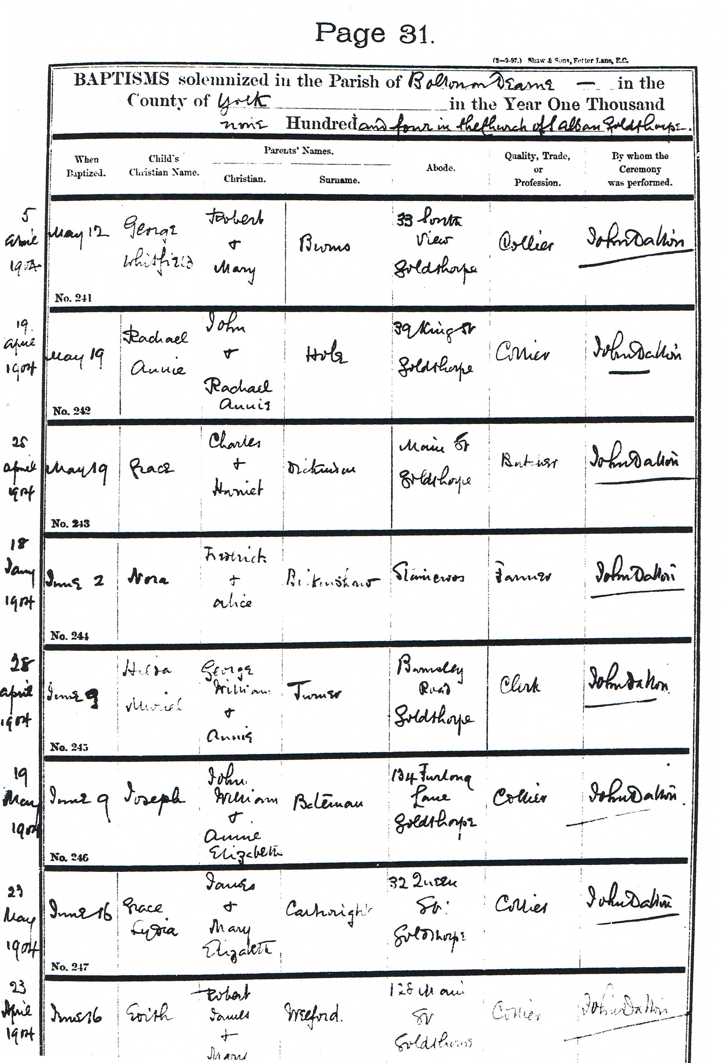 | CHILDREN | 1. | Rachel Annie Hole FEMALE | | BIRTH | 19 April 1904 | Goldthorpe, Yorkshire | CHR | 19 May 1904 | Bolton Upon Dearne | RESIDENCE | 19 May 1904 | ; 39 King Street, Goldthorpe | DEATH | | ; |