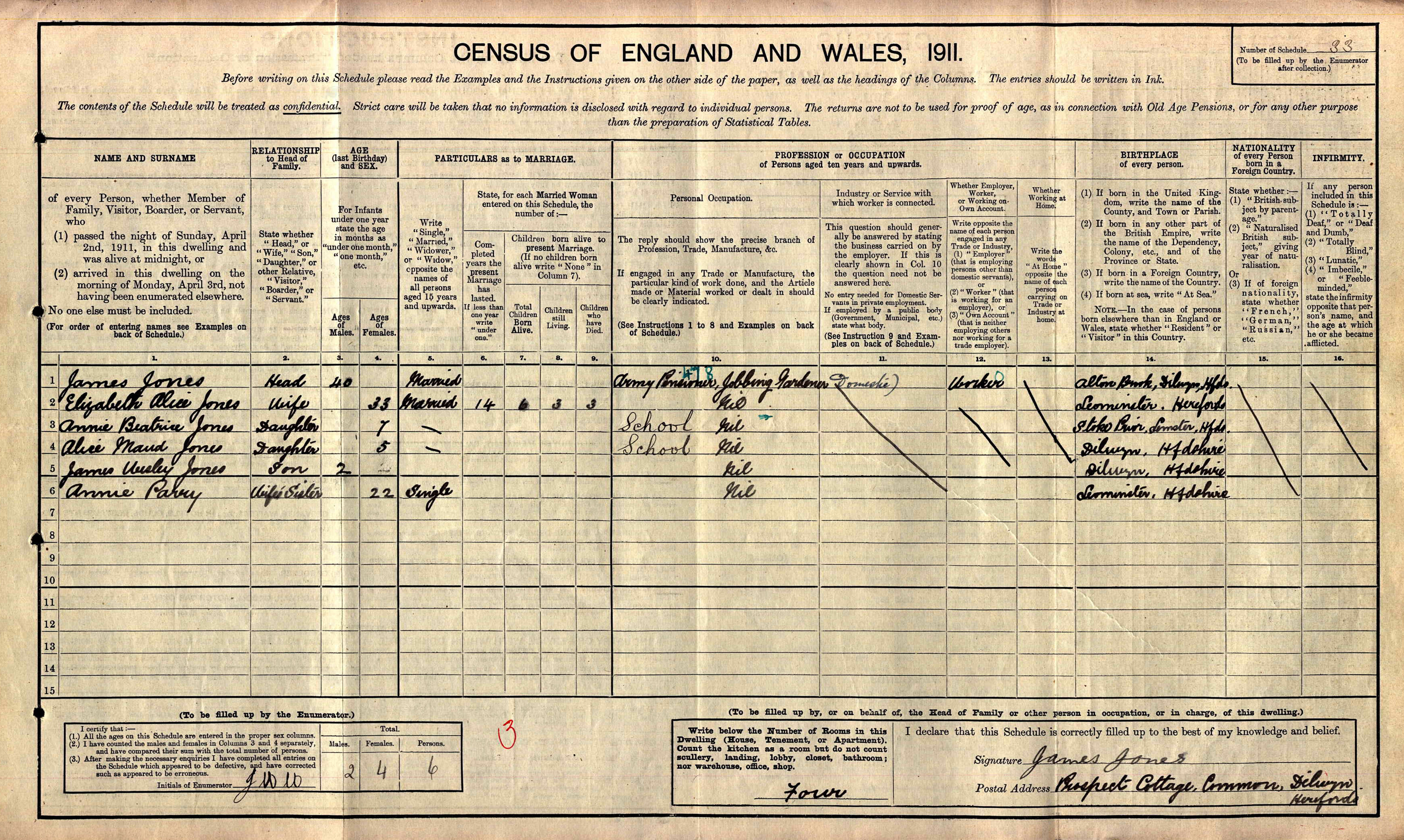 | 2. | Elizabeth Alice E Parry12,19,24,26 FEMALE | | BIRTH | July 1877 | Leominster, Herefordshire, United Kingdom26 | BIRTH | about 1878 | Leominster, Herefordshire24 | BIRTH | about 1878 | Leominster, Hereford, England12 | BIRTH | about 1878 | Leominster, Herefordshire, , England98 | CENSUS | about 1881 | 15 Back Queen Street, Kidderminster, Worcestershire | RESIDENCE | about 1881 | ; St Mary, Worcestershire, England12 | RESIDENCE | between 1891 and 1901 | ; 45 Bridge Street, Leominster, Herefordshire | RESIDENCE | about 1891 | ; Leominster, Herefordshire, , England24 | RESIDENCE | 2 April 1911 | At the time of the Census.; Prospect Cottage, Common, Dilwyn, Herefordshire, England, United Kingdom98 | CENSUS | 2 April 1911 | Prospect Cottage, Common, Dilwyn, Herefordshire, England, United Kingdom | DEATH | | ; | MARRIAGE | about June 1897 | James Jones; 98 |