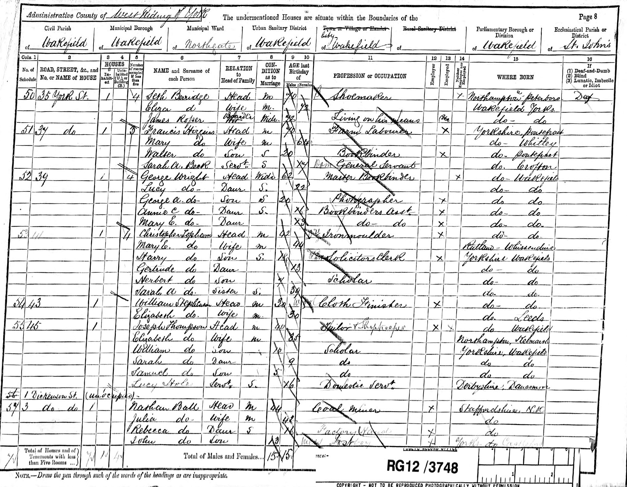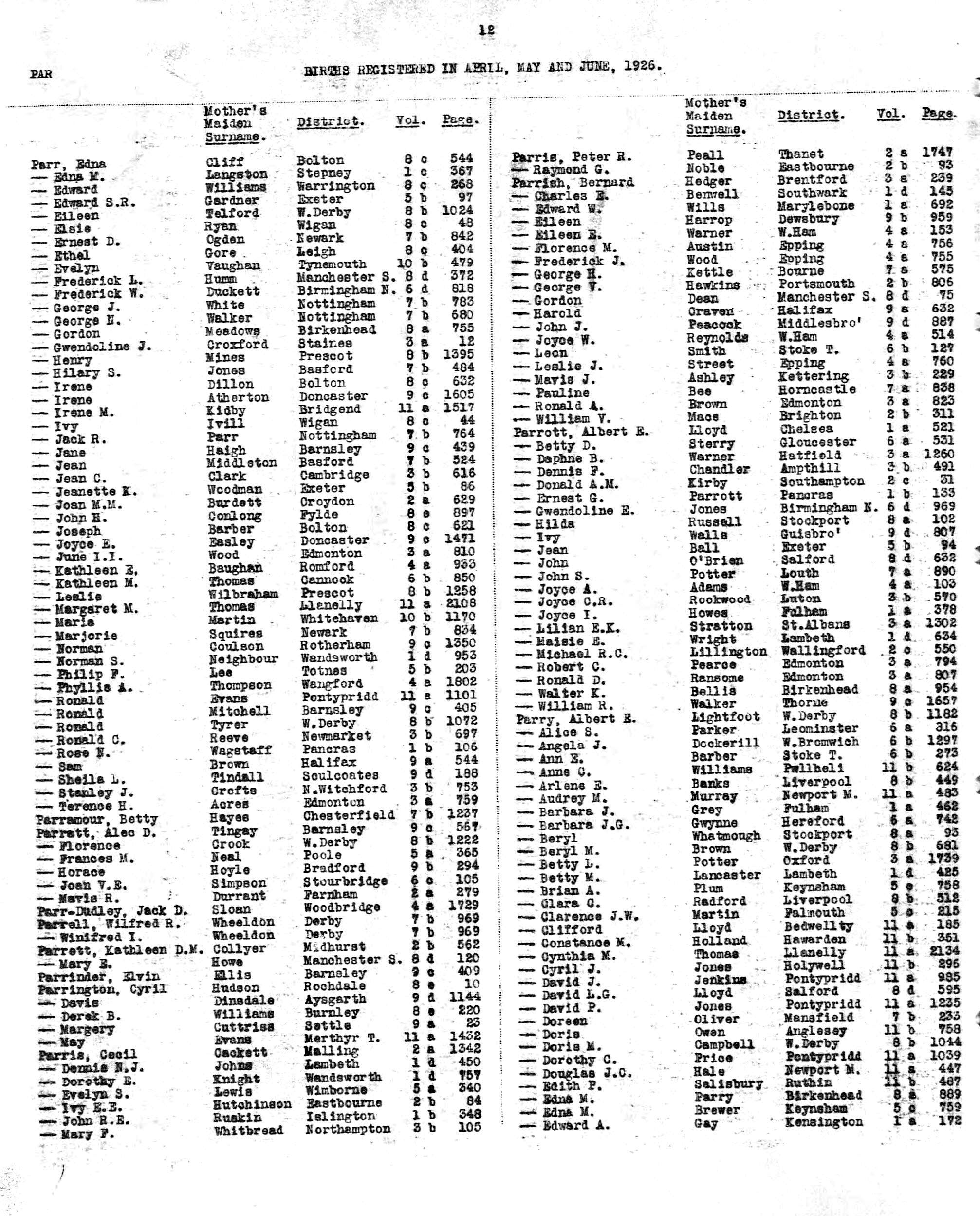 Home Surname List Name Index Sources Email Us | Pedigree Chart | 2 John Edward Parry1,2  | 4 Joseph Edward Brazier2,3,4  | 8 William James Brazier5,6 |  | b: about 1864 in Islington, Middlesex, England7 m: 21 April 1885 in Martley, Worcestershire d: 9 February 1928 in York, Ontario, Canada8 | | b: 15 February 1889 in Pensax, Worcestershire, , England9,10 m: 24 May 1920 in Stoke Prior, Leominster, Herefordshire4 d: 5 February 1954 in Pontefract, Yorkshire West Riding, England, United Kingdom1,3 | 9 Mary Elizabeth Radford2,11,12 |  | b: September 1856 in Worcestershire, United Kingdom2,7,9,11,12 d: about June 1891 in Worcester, Worcestershire, England, United Kingdom13 | | b: 7 March 1915 in Leominster, Herefordshire1,2 m: 26 December 1938 in Farsley, Leeds14 d: 18 July 1991 in Barnsley, South Yorkshire15 | 5 Amy Beatrice Parry2,3,4,16,17,18,19  | 10 John Parry3,7,9,10,11,12,17,18,20,21,22,23,24 |  | b: about 1852 in The Wharf, Lindridge, Worcestershire7,18,20,23,24 m: 1 December 1873 in Leominster, Herefordshire18 d: March 1925 in Leominster, Herefordshire, , England23 | | 1 Living | b: 19 April 1891 in Leominster, Herefordshire2,10,17,18 d: 27 November 1951 in Southmoor House, Hospital, Hemsworth, West Yorkshire3,17 | 11 Martha Warburton2,17,23,24  |  | b: about 185223 d: September 1920 in Leominster, Herefordshire, , England23 | | | b: m: d: | 6 John Edward Wood9,10,25,26  | 12 George Wood2,9,20,27,28,29,30,31,32 |  | b: 20 December 1848 in Doncaster2,20,27,32,33 m: 26 November 1874 in The Parish Church Hatfield34 d: March 1900 in Ardsley, Barnsley, Yorkshire20,35 | | 3 Mary Wood16  | b: 27 June 1879 in Roystone, Barnsley, Yorkshire9,10,25 m: 1 January 1920 in Barnsley Register Office36 d: 13 May 1938 in Farsley, Leeds | 13 Mary Houlgate2,9,10,29,31,37 |  | b: about 1855 in Woodhouse, Doncaster, Yorkshire2 d: April 1937 in Ardsley, Barnsley, Yorkshire | | b: 24 September 1920 in Stairfoot, Barnsley1 d: 5 September 1999 in Barnsley, South Yorkshire, England, United Kingdom1 | 7 Ruth Dennis10,16,38  | 14 John William Dennis1,2,10,17 |  | b: 12 July 1873 in Alfreton, Derbyshire, England, United Kingdom2,17 m: 11 July 1896 in Goldthorpe, Yorkshire, England17,39 d: about September 1933 in Doncaster, Yorkshire West Riding, England1 | | b: 7 June 1897 in Goldthorpe, Yorkshire West Riding, England, United Kingdom1,10 d: 3 February 1985 in Grimethorpe Barnsley1,40 | 15 Lucy Hole2,9,12,17,20  |  | b: about 1875 in Clay Cross, Derbyshire, England10 d: 27 December 1904 in Goldthorpe, Yorkshire, England17,20 | |