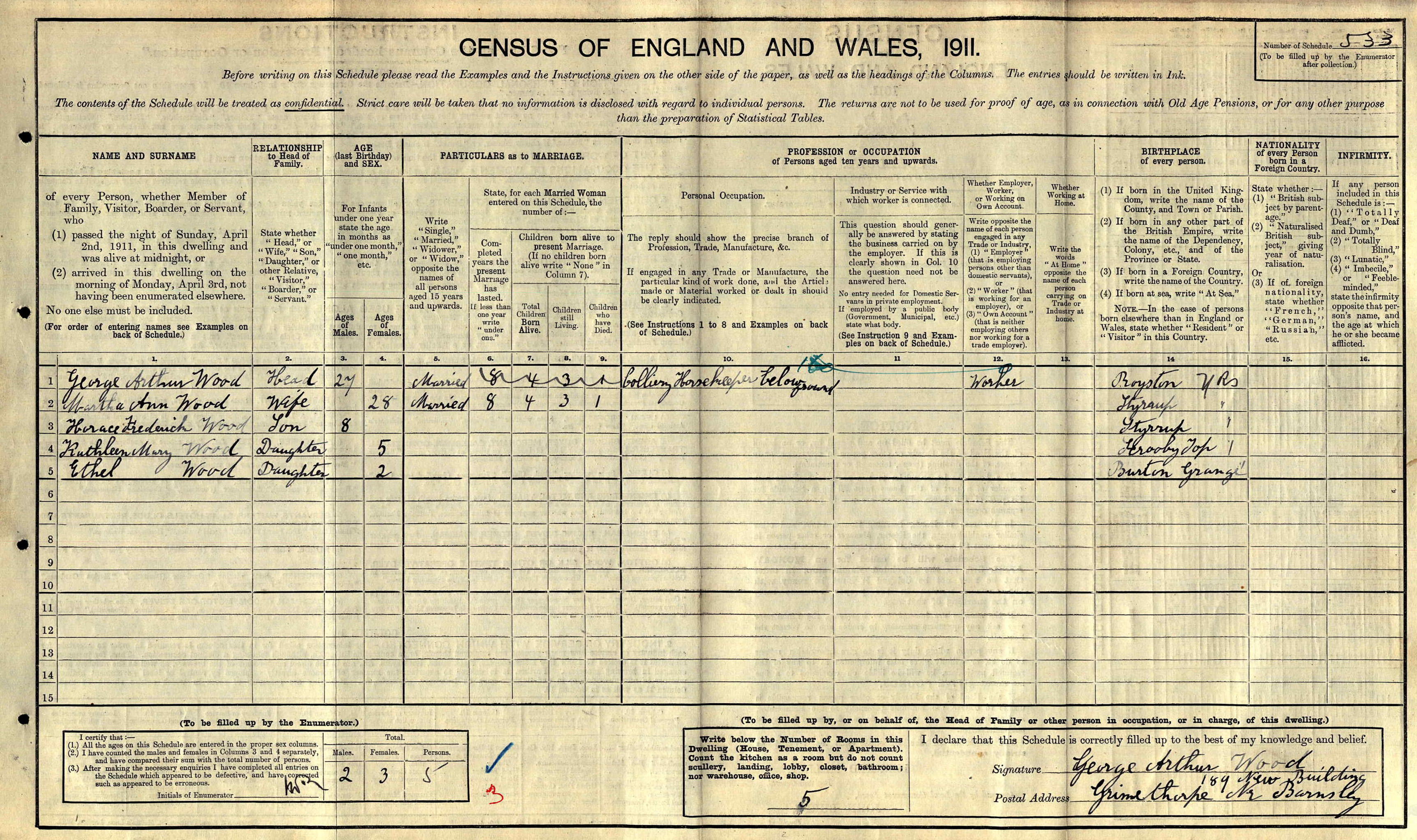 | 2. | William Houlgate Wood2,78 MALE | | BIRTH | June 1878 | Yorkshire - West Riding, United Kingdom2 | BIRTH | 30 June 1878 | Carlton, Barnsley, Yorkshire2,31,78 | CHR | 7 July 1878 | Royston Parish Church79 | BAPTISM | 7 July 1878 | Royston, St John the Baptist, Yorkshire, England31 | BIRTH | about 1879 | Carlton, Yorkshire, England10 | BIRTH | about 1879 | Carlton, Yorkshire, England9 | CENSUS | about 1881 | Pinfold Hill, Ardsley, Barnsley, Yorkshire | CENSUS | about 1891 | Whitecross Farm, Worsborough, Barnsley, Yorkshire | OCCUPATION | about 1891 | ; Farm Labourer | RESIDENCE | about 1891 | ; Worsborough, Yorkshire, England9 | CENSUS | about 1901 | 49 Sykes Street, Ardsley, Barnsley56 | OCCUPATION | about 1901 | ; Blacksmith Striker | RESIDENCE | about 1901 | ; Ardsley, Yorkshire, England10 | CENSUS | about 1911 | 42 New Bgs, Grimethorpe, Barnsley, Yorkshire58 | RESIDENCE | 2 April 1911 | ; Brierley, Yorkshire-West Riding, England78 | OCCUPATION | 20 June 1915 | ; Horsekeeper | DEATH | | ; | MARRIAGE | about September 1901 | Frances Watson; Barnsley, Yorkshire |