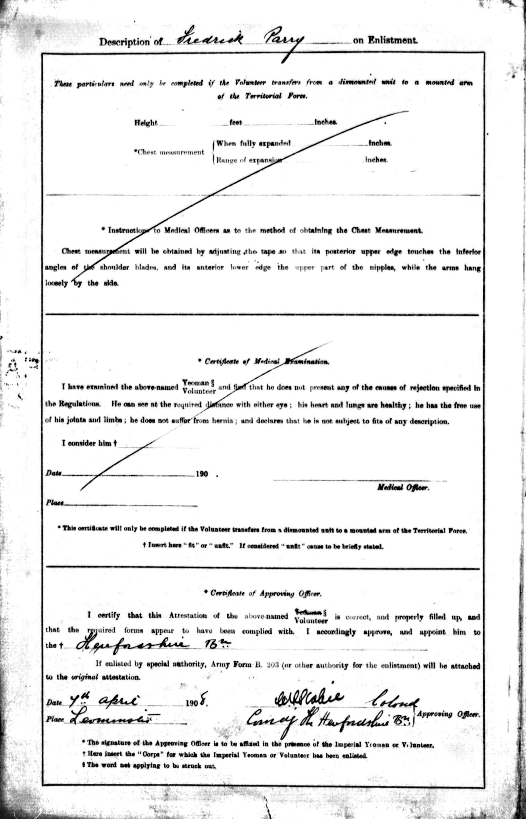 | 5. | Frederick Wesley Parry2,18 MALE | | BIRTH | about February 1885 | Leominster, Herefordshire2,18,22,99 | CENSUS | between 1891 and 1901 | 45 Bridge Street, Leominster, Herefordshire | RESIDENCE | about 1891 | ; Leominster, Leominster, Herefordshire, England22,99 | RESIDENCE | 2 April 1911 | ; Leominster, Herefordshire, , England18 | MARRIAGE | about 1915 | Alcester, Worcestershire |